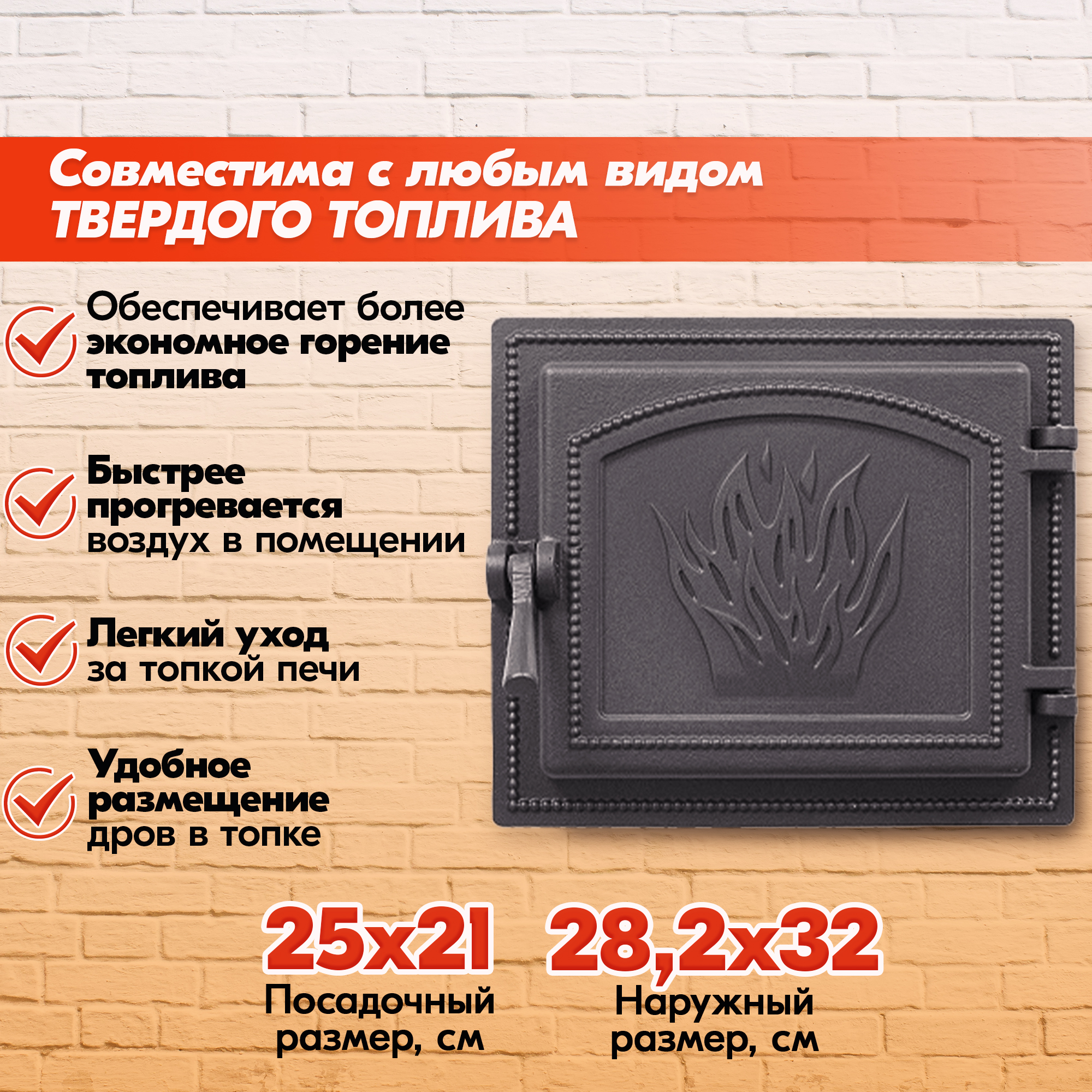 Наружный размер и посадочный размер для каждой печной дверки указан на изображениях в каждой карточке.
