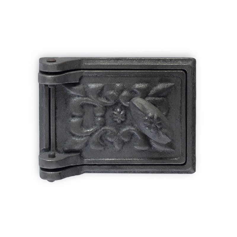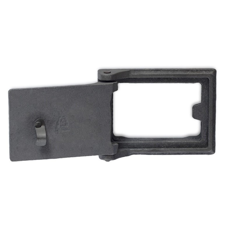 Съёмная литая крышка. Полностью снимается, что упрощает процесс прочистки колодцев печи. Подобные дверцы бывают оборудованы термошнуром, что делает прилегание рамки к крышке более плотным.
