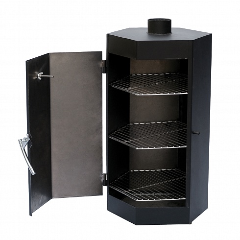 Вертикальная камера — прямоугольный шкаф, предназначенный для холодного копчения. Укомплектован полками — решетками и крючками для подвешивания тушек рыбы и птицы.