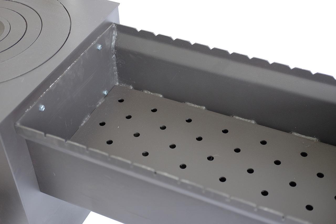 Дно мангала перфорировано по всей площади, для перемещения лишней золы в зольный ящик и для обеспечения дополнительного притока кислорода снизу.