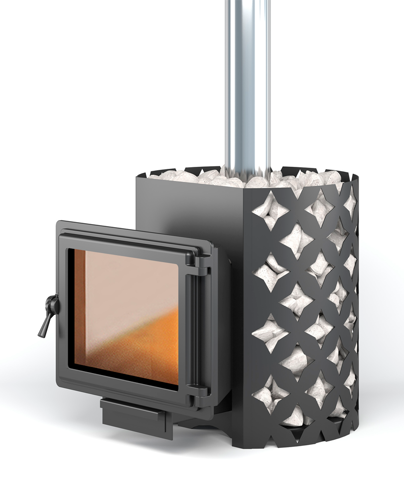 Для устройства наружной открытой каменки печь ЭТНА оснащается металлическим кожухом с прорезным рисунком оригинального дизайна. Пространство между печью и кожухом из двухмиллиметровой стали заполняется камнями для бани, которые выполняют роль теплонакопителя, перераспределяют тепло от стенок топки и защищают парящихся от жёсткого инфракрасного излучения. Воду подают на нагретые камни, с которых полученный пар распространяется по всему объёму парной.