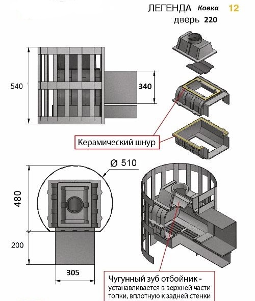 Банная чугунная печь Легенда Ковка 12  (220) укомплектована чугунной герметичной, самоохлаждаемой дверцей Везувий 224  с жаропрочным стеклом «SHOT ROBAX», с оборудованной системой самоочистки, и  конвекционно-вентилируемый кожухом "Ковка". В конструкции данной печи предусмотрен топочный тоннель длиной 250 мм, при помощи которого печь топится из соседнего помещения, смежного с парильным.