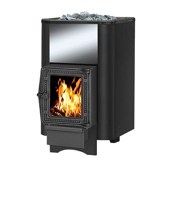 Дровяная печь для бани Русичъ предназначена и разработана для отопления парильных помещений, получения пара, а также нагрева воды. Объемная, вентилируемая каменка позволяет максимально быстро нагреть камни с четырёх сторон в кратчайшие сроки. Большая масса камней (до 40 кг!), закладываемая в каменку печи, нагревается до 350 °С, что позволяет обеспечить стабильность температуры в парилке и является мощным парогенератором. Поверхность нагрева печи охвачена сверхъемким наружным конвекционно-вентилируемым кожухом-конвектором, что значительно ускоряет нагревание воздуха в парилке за счёт образуемого им мощного конвекционного потока. Топка печи выполнена из специальной конструкционной стали толщиной до 12 мм. Сталь благодаря своей устойчивости к высоким температурам не подвергается деформации. Топочная дверца изготовлена из высококачественного чугуна. Длинная колосниковая решётка из массивного литейного чугуна, обеспечивает равномерное горение дров, столь необходимое для банной печи. Выдвижной зольный ящик позволяет удалить накопившуюся золу, не прерывая горения и эффективно регулировать его интенсивность. Все эти характеристики позволяют утверждать, что эту модель можно считать самой скоростной печкой по прогреву парильного помещения. Печь ТМ Везувий Русичъ имеет сертификат Госстандарта России, санитарно-эпидемиологическое заключение, сертификат пожарной безопасности и соответствует требованиям пожарной безопасности (НПБ 252-98). Банная печь Русичъ С укомплектована чугунной дверцей с жаропрочным стеклом. Дровяная печь Везувий Русичъ 16 С рассчитана на объем парильного помещения 8-16 м3. В конструкции данной печи не предусмотрен топочный тоннель, что позволяет топить её прямо из парильного помещения.