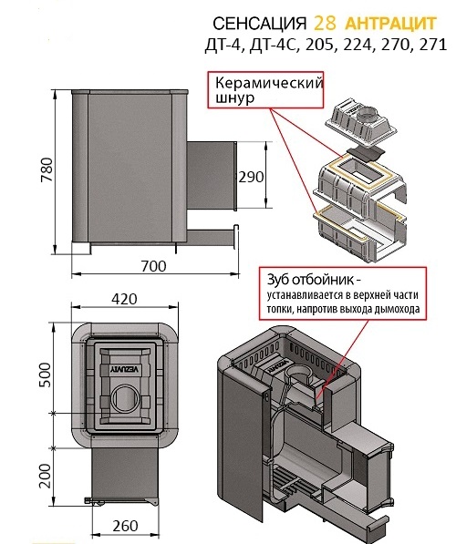 Преимущество печи в том, что топка печи состоит из 3-х элементов. На стыке между ними используется керамический шнур с рабочей температурой 1200 градусов. То есть топка печи абсолютно герметична! Для фиксации деталей между собой применяется болтовое соединение, что даёт 100% гарантию безопасности при эксплуатации.