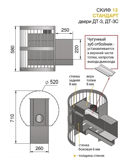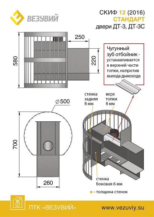 Банная печь Скиф ВС укомплектована чугунной дверцей с жаропрочным стеклом и имеет конвекционно-вентилируемый кожух (сетка), который изготовлен из калиброванного прута диаметром 6 мм. Дровяная печь Везувий Скиф 12 ВС рассчитана на объем парильного помещения 6-14 м3. В конструкции данной печи предусмотрен топочный тоннель длиной 250 мм, при помощи которого печь топится из соседнего помещения, смежного с парильным. Банная печь Скиф 12 ВС (С) относится к так называемым печам – сеткам. По всей поверхности теплообменника в сетку закладываются камни, которые образуют своеобразный каменный конвектор, защищающий от слишком интенсивного инфракрасного излучения нагретых частей печи и одновременно, благодаря возникающей конвекции через зазоры между камнями, очень эффективно обогревающий парную. Большая масса камней накапливает тепло и создает мягкое и комфортное излучение, как будто печь сложена из кирпича.
