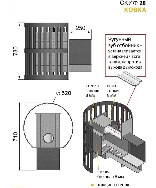 Технические характеристики банной печи Скиф 22 Панорама: Высота: 730 мм Ширина: 570 мм Глубина: 770 мм Вес: 105,5 кг Вес камней: 150 кг Диаметр дымохода: 115 мм Длина топочного туннеля: 250 мм Объем парильного помещения: 12-22 куб. м Топочная дверца: Со стеклом / Панорамного типа