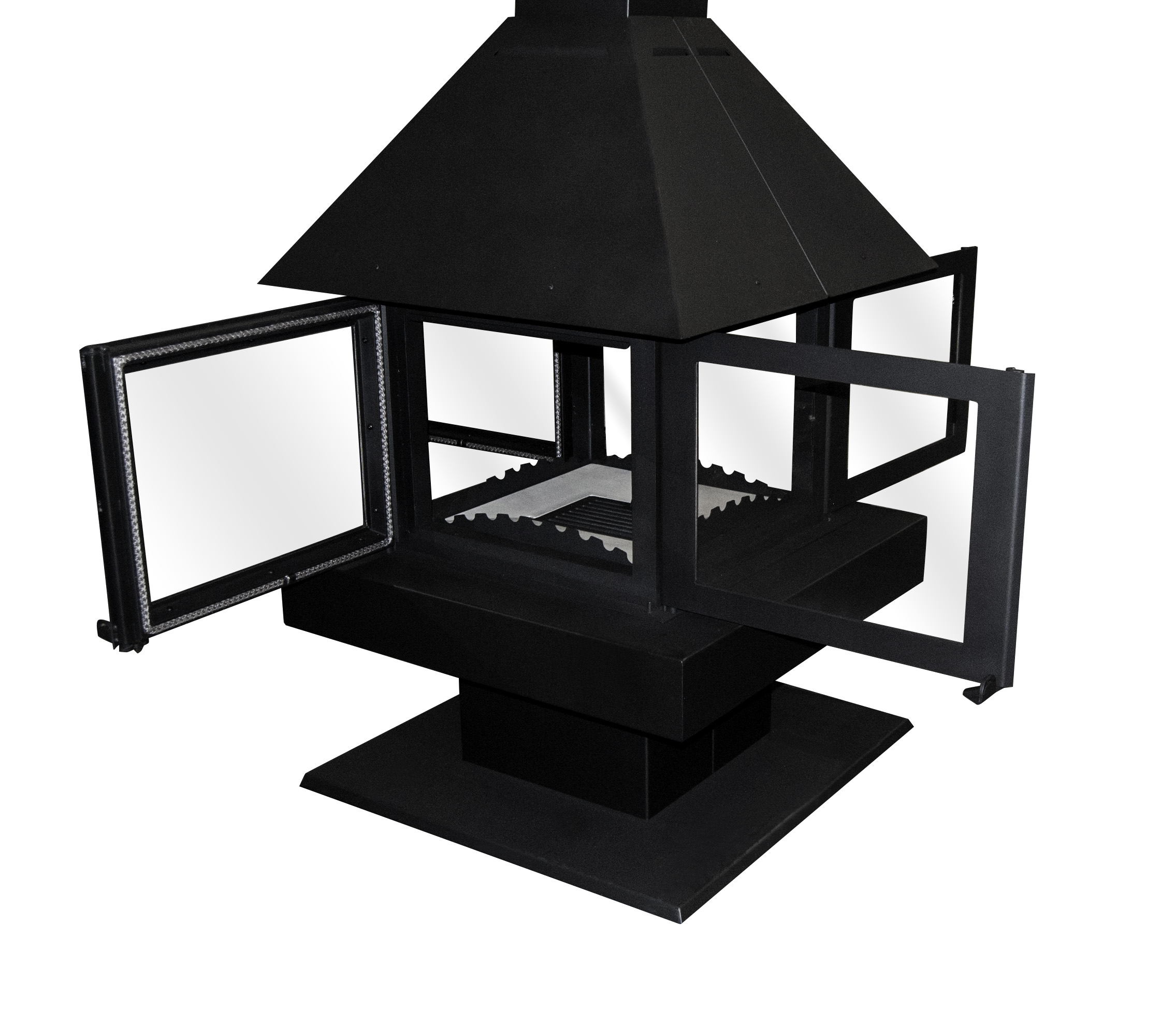 Камин остеклен с четырех сторон. Вы можете сделать его центром гостиной и смотреть на огонь с любой точки. Такие стекла делаются всего в 2 странах: Германии и Японии. Оно выдерживает температуру до 750 градусов. Но если ударить кочергой, то может треснуть. Через стекло вы любуетесь огнем, следите за прогоранием дров и подкладкой новых.