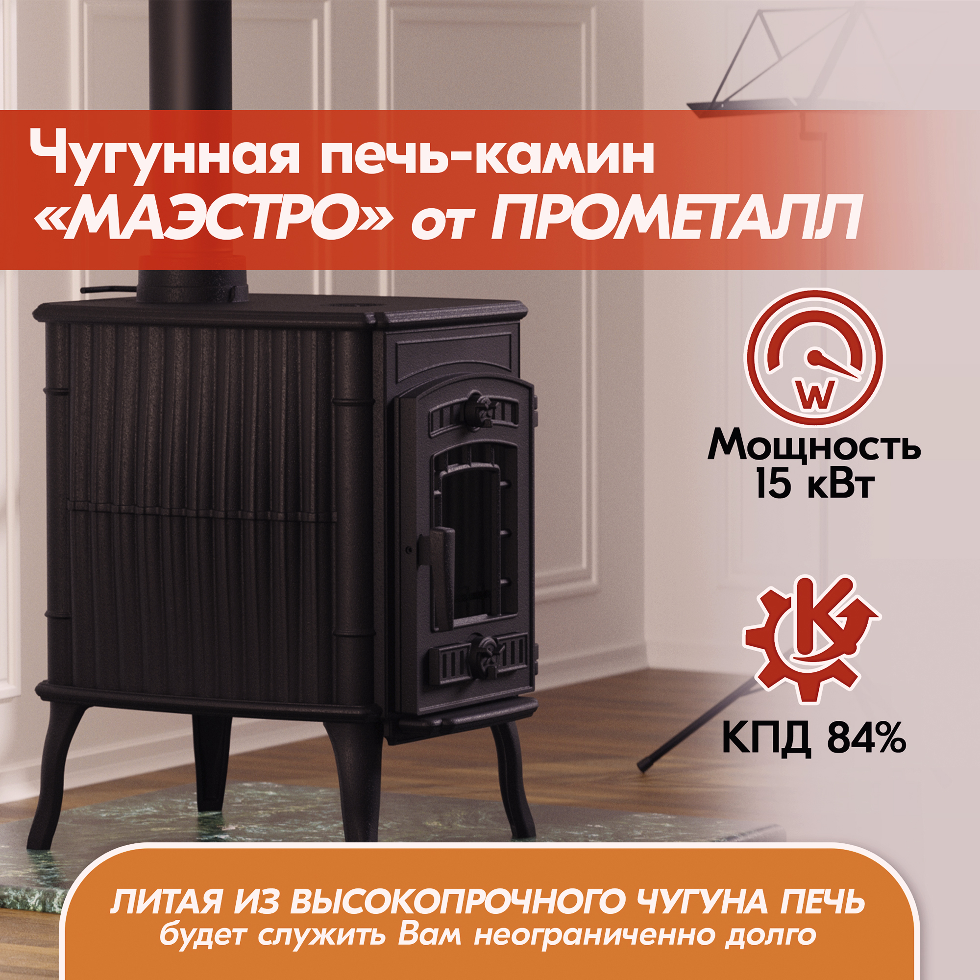 Чугунная печь-камин «Маэстро» отличается современным дизайном и высокой мощностью 15 кВт, способна достаточно быстро обогреть помещение объемом до 300 куб.м или площадью 120 кв. м при высоте потолка 2,5 м!