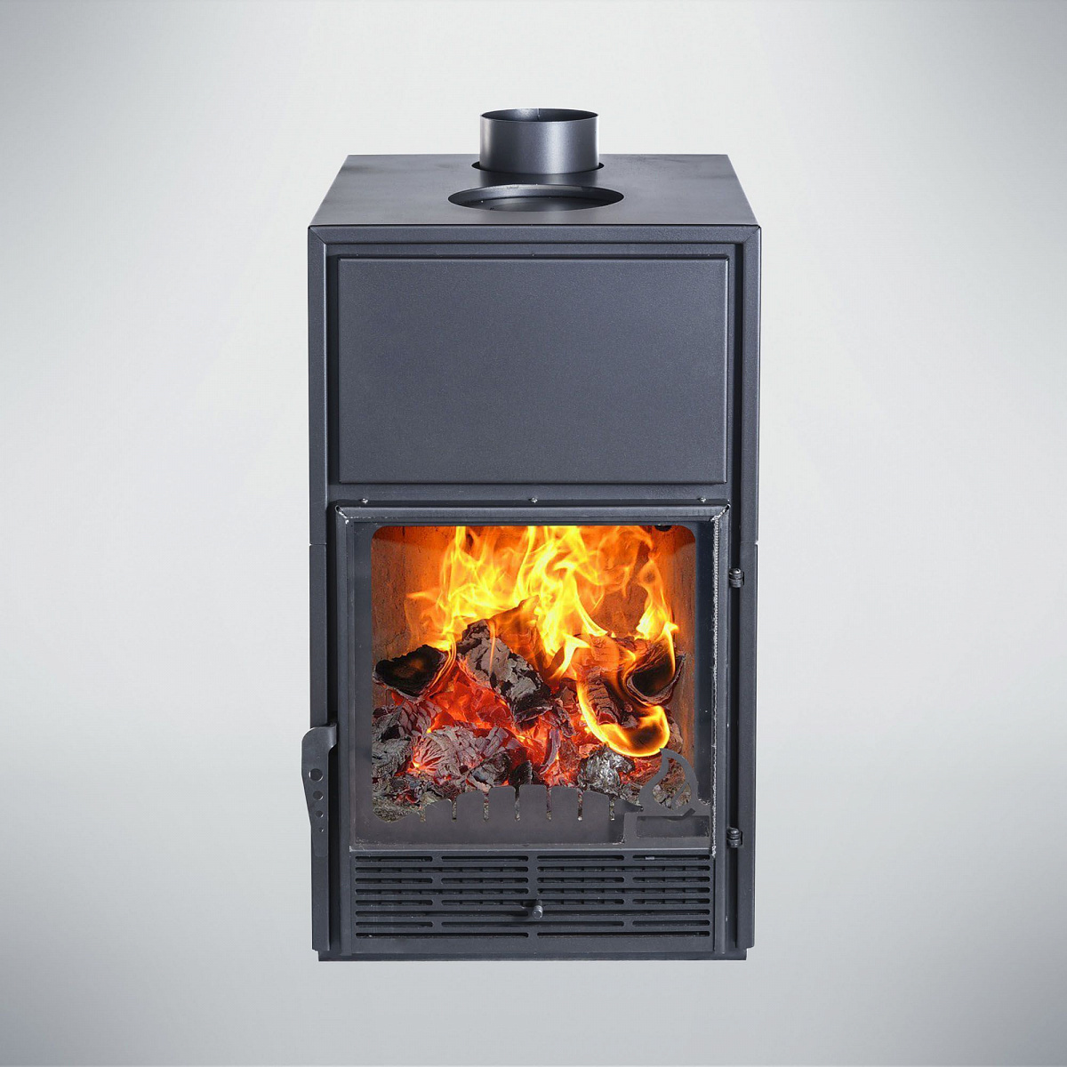 Стальной отбойник пламени внутри топки не позволяет дымовым газам выходить сразу в дымоход, а подводящийся в верхнюю часть топки прогретый воздух обеспечивает дожиг образующихся газов и, соответственно, высокий КПД и более экономичный расход топлива.
