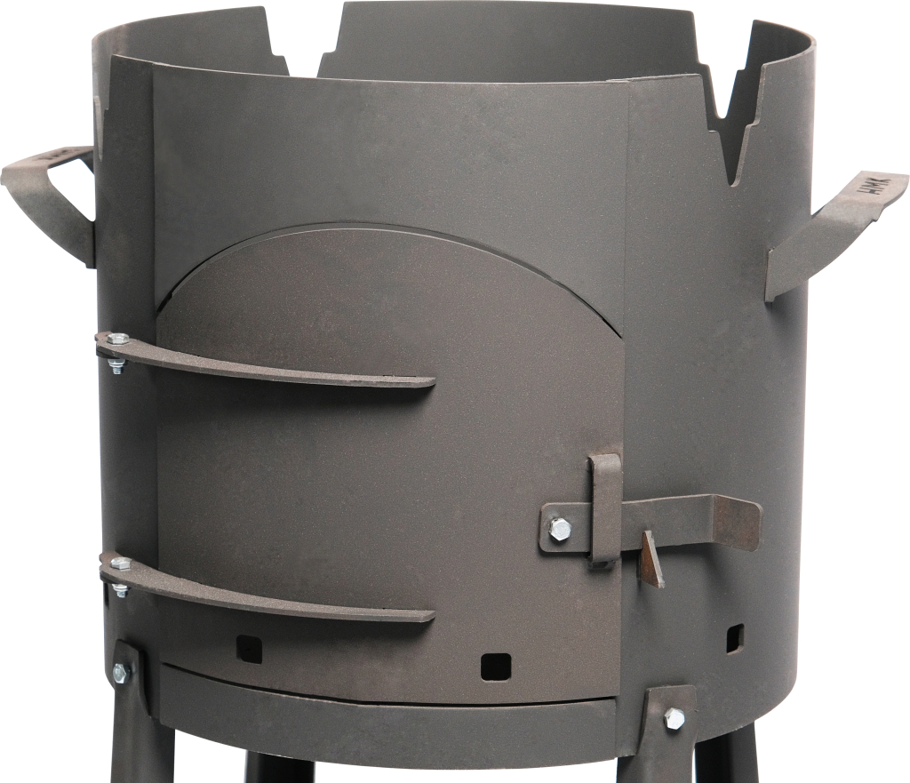 Печь под казан «Балхаш» предназначена для приготовления пищи в казане с использованием пламени, возникающего от сгорающих дров. Печь проста в использовании: дрова закладываются в топочную камеру, казан устанавливается сверху. Оборудована ручками для транспортировки и съемными ножками.